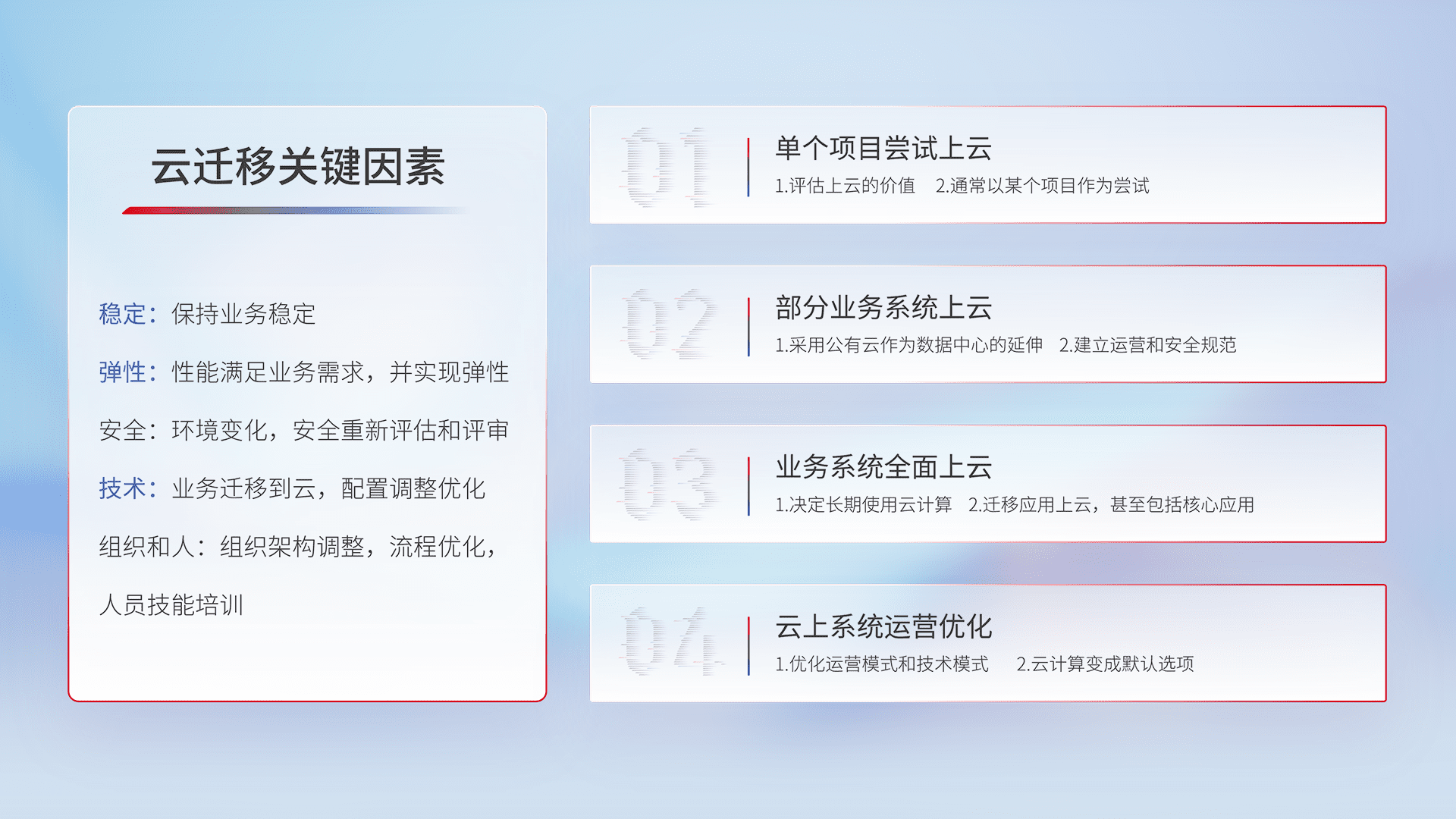 结合实际业务,,,,从规划设计、、云平台选型、、、云原生改造、、、、数据迁移、、、集成交付,,迁移全过程为客户识别最佳上云路径,,,做好风险识别管理,,设计网络架构、、身份权限、、安全审计合规、、、操作审计、、、日志审计、、、监控告警策略、、多站点容灾设计等,,,,对云上基础设施进行整体规划,,提升IT治理水平,,,,以满足弹性、、、、高可用、、高性能的需求。。。。